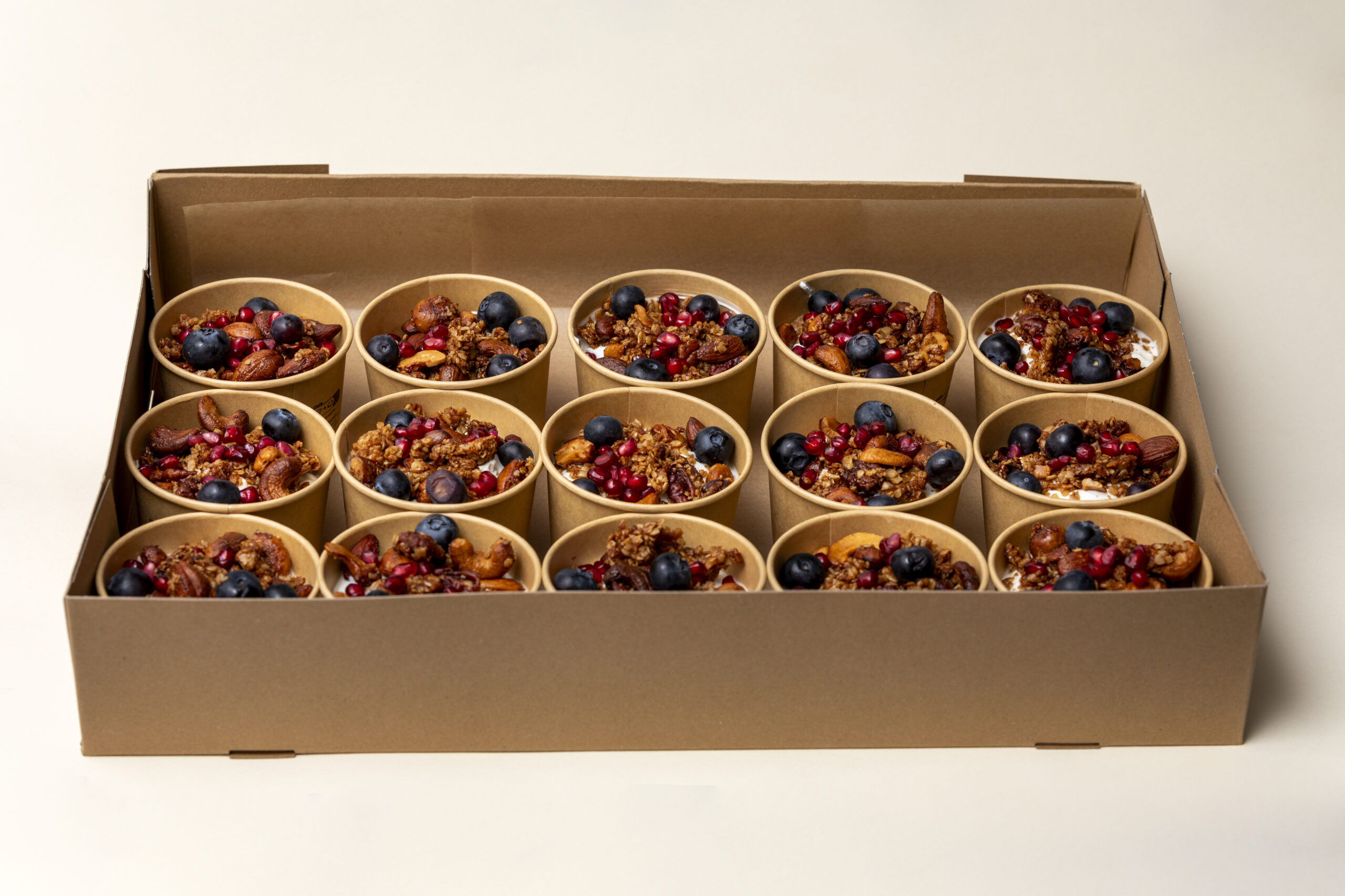 Onze box met is gevuld met Griekse yoghurt, huisgemaakte granola, blauwe bessen en granaatappelpitjes, heerlijk als aanvulling op de lunch.